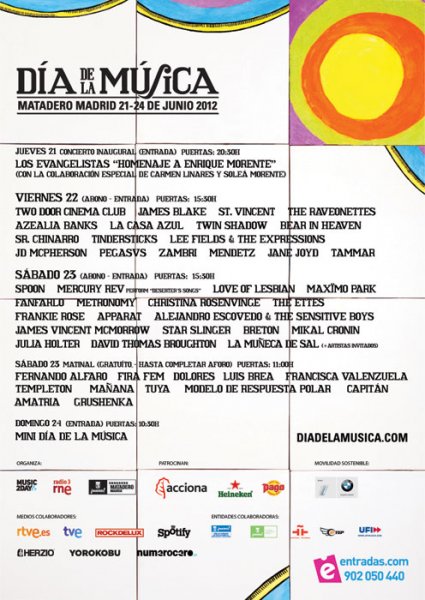 Con estos argumentos, sólo falta conocer el cartel y confirmar que, como dicen sus organizadores, el Día de la Música “prefiere funcionar como una constelación con multitud de estrellas repartidas por sus escenarios, del primero al último, en la que todas brillan y ninguna juega la carta del relleno”. Para esta edición 22 artistas internacionales de entre todos los participantes presentando sus últimos trabajos discográficos y 11 de ellos debutando en directo en Madrid. Mercury Rev, Two Door Cinema Club, James Blake, St. Vincent, The Raveonettes, Spoon o Maxïmo Park. O grupos españoles ya consolidados, como Love of Lesbian, que presentará su nuevo disco, seguido de Fanfarlo, los festivos La Casa Azul y Cristina Rosenvinge entre otros. Todo sin olvidar que hasta los melómanos más pequeños tienen su propio Mini Día de la Música, que se celebrará durante la mañana del domingo. En esto también es pionero este New Energy Festival. Os seguiremos contando.