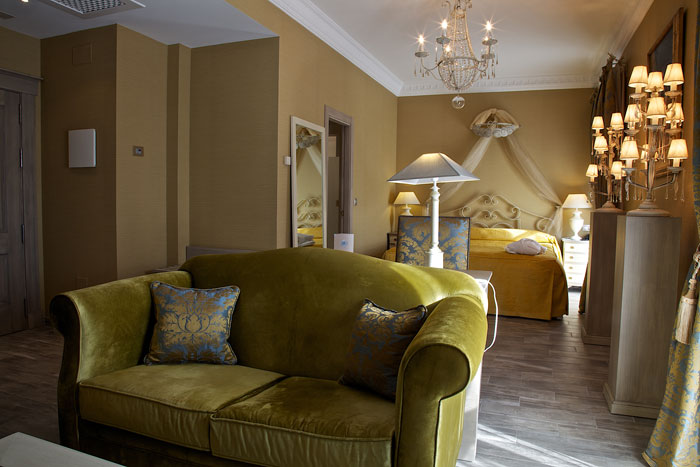 Lo que antiguamente era el lugar donde se almacenaba el trigo, es en la actualidad el restaurante, que mantiene sus dos plantas originales. Las habitaciones se reparten en tres plantas con arreglo a nombres que fueron importantes en La Ilustración. Son estancias de estilo romántico (no podía ser de otra manera), coloridas, con paredes adamascadas y cortinones de terciopelo.