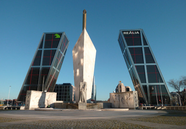 Plaza de Castilla (square) in Madrid (Spain). At the right and left, Puerta de Europa (‘Gate of Europe’) inclined buildings. At the centre, Monument to Jose Calvo Sotelo, and behind it, the-so-called ‘Obelisco de la Caja’.