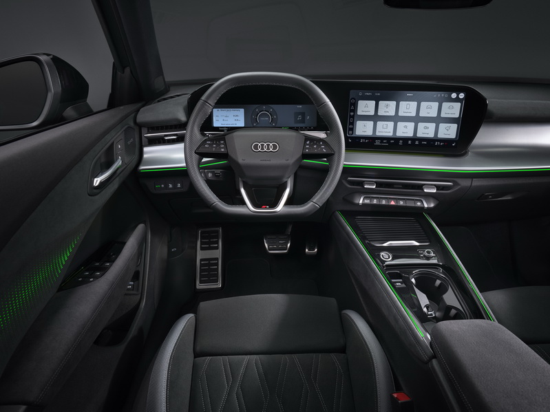El sistema de info-entretenimiento utiliza Android Automotive OS, con aplicaciones de terceros como YouTube integradas en la Audi Application Store. El asistente de voz con inteligencia artificial permite controlar funciones del vehículo. En términos de sostenibilidad, el interior utiliza materiales reciclados, como poliéster 100% reciclado en tejidos y Econyl en alfombrillas, procedente de redes de pesca y residuos industriales.