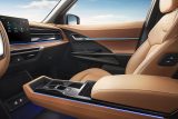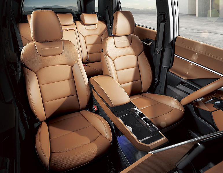 Techo y elementos interiores en negro, asientos de cuero natural ergonómicos, conductor ajustable en 8 posiciones con soporte lumbar, delanteros calefactables. Consola central flotante con cargador inalámbrico, portavasos y almacenamiento. Puertos USB-C (dos delante, dos detrás), compartimento para smartphone en respaldos y salidas de aire traseras para confort en viajes largos.