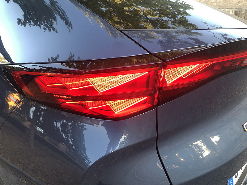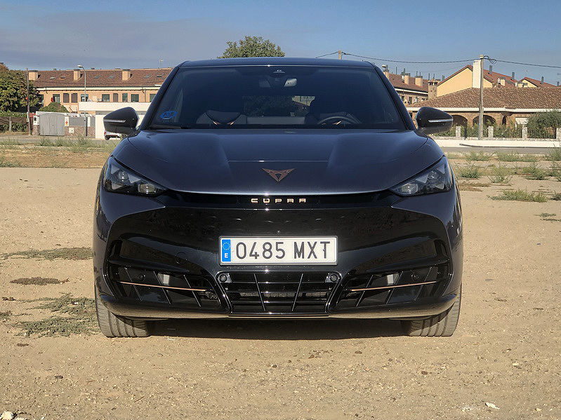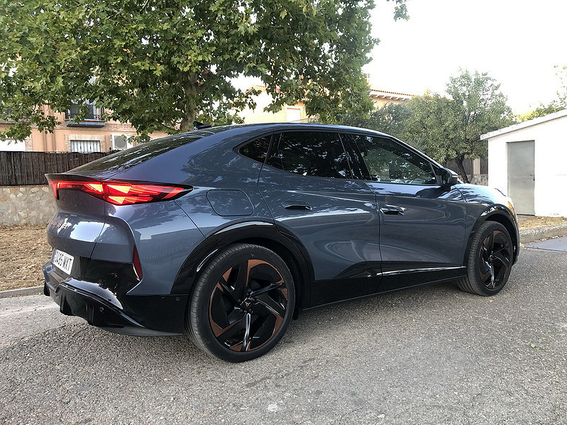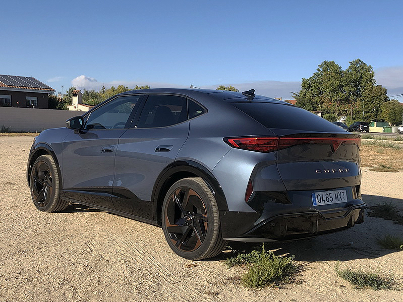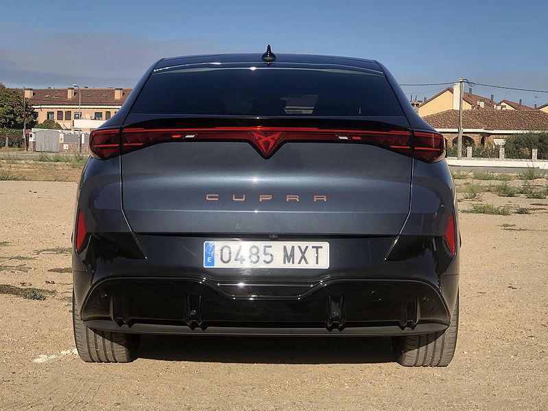 Los faros LED matrix en forma de constelación de triángulos –la firma lumínica de CUPRA– proyectan una mirada felina y futurista, mientras que el spoiler integrado en la barra de luces traseras LED de lado a lado añade un toque deportivo que fluye como un río de luz. No hay rejilla frontal falsa; en su lugar, un frontal limpio y esculpido.