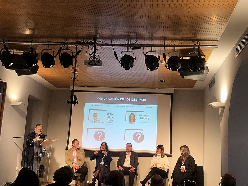 La mesa final, con Eugenia Fierros (presidenta de ONETE), Juan Andrés Alba (Jefe de Servicio de Turismo y Eventos del Ayuntamiento de Alcalá de Henares), Isabel González (concejala de turismo de Nuevo Baztán), Javier Monge (ejecutivo de comunicación de la Red de Pueblos Gastronómicos de España) y Nani Arenas, analizó la interacción entre destinos turísticos y medios, identificando deficiencias y propuestas de mejora.