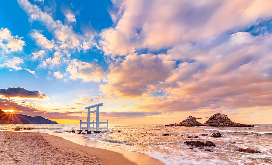- Puesta de sol en el horizonte de la playa de Itoshima en Fukuoka